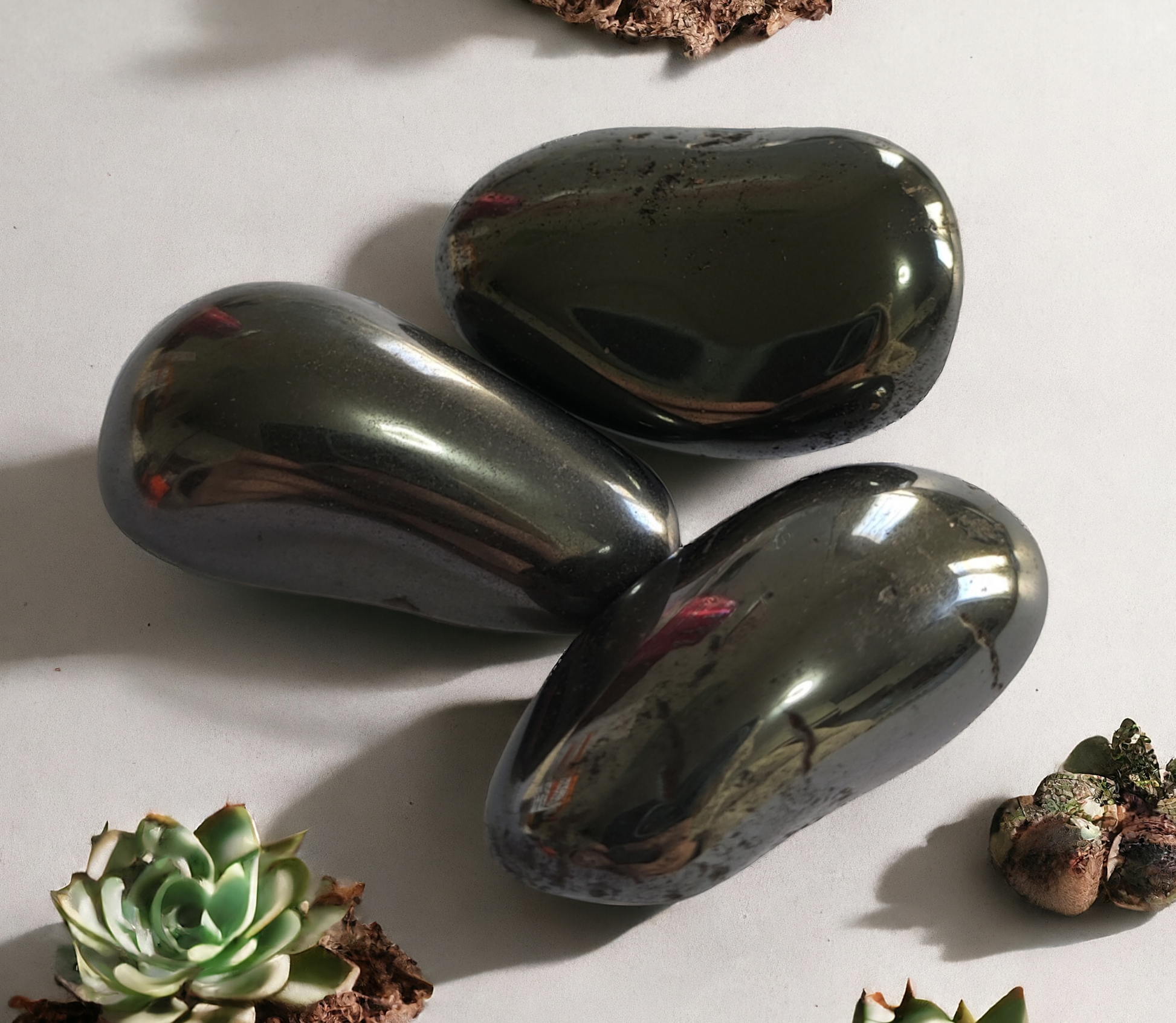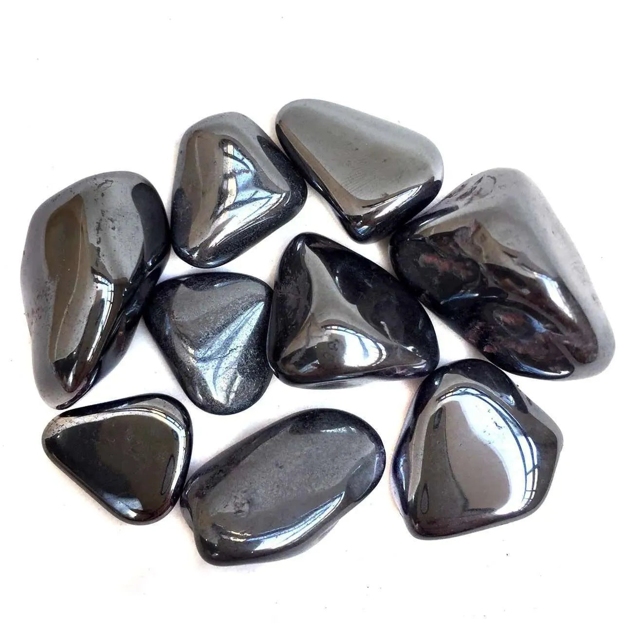 - Cada pieza refleja brillos metálicos únicos propios de la hematita