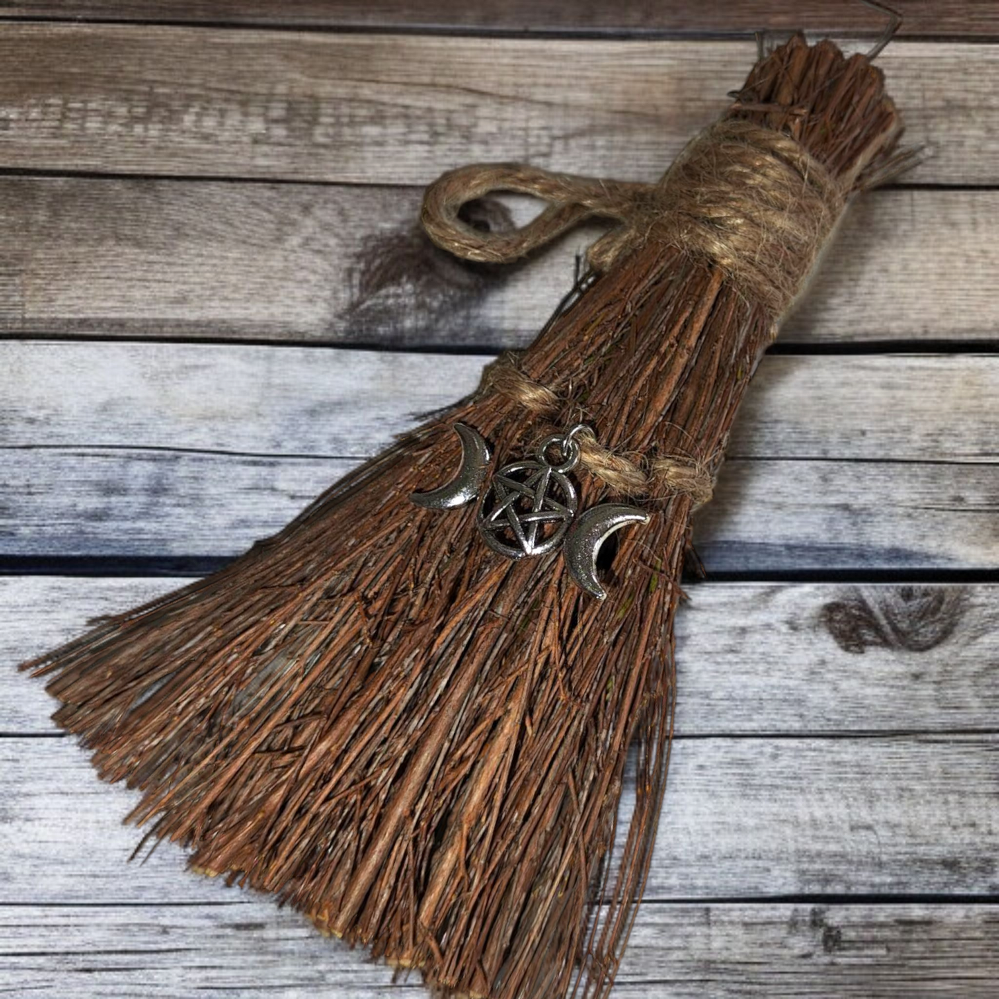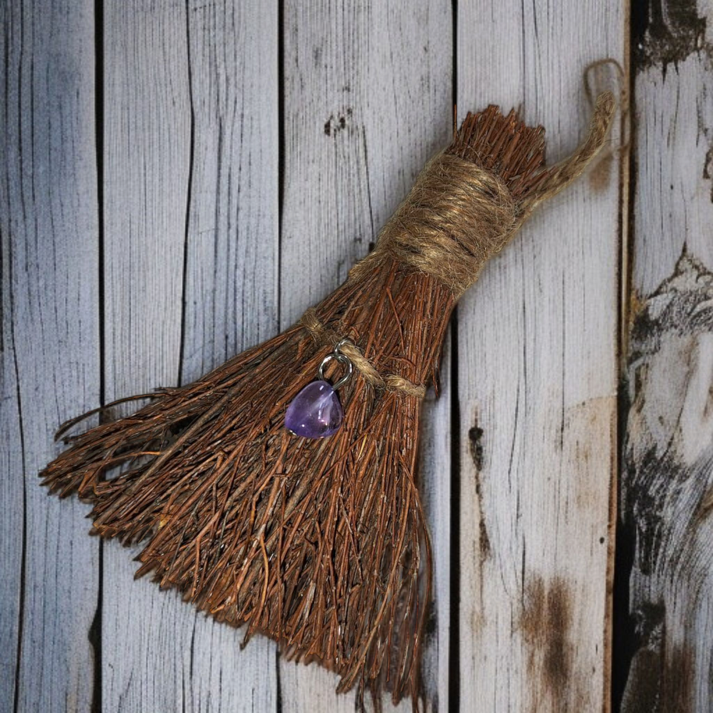 Estas escobitas artesanales están elaboradas con ramitas naturales y atadas a mano con cuerda de yute. Son un símbolo tradicional de protección y limpieza energética en el hogar o espacio ritual.