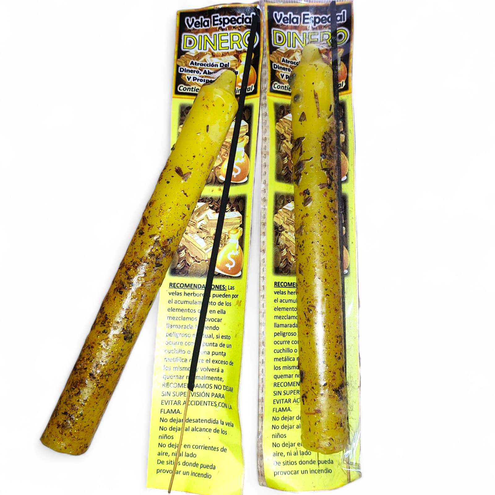 Está elaborada con cera ritual y una combinación de hierbas, resinas y elementos naturales visibles, tradicionalmente asociados a la prosperidad, la estabilidad y la apertura de caminos económicos.